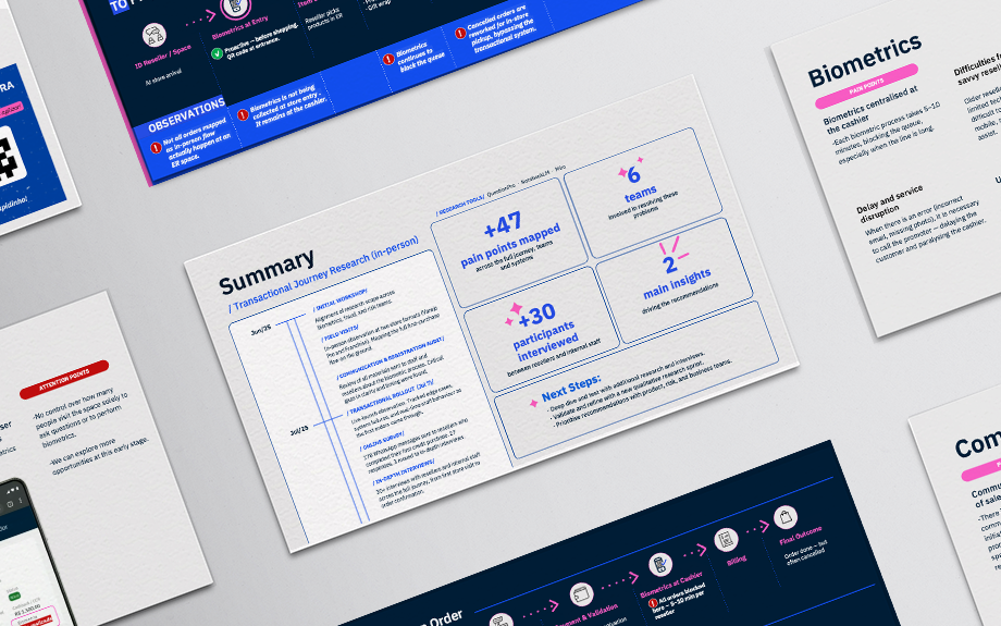 End-to-end research across 6 teams and 12 systems to fix a broken anti-fraud journey — without breaking the in-person magic. The two directions I identified became the leading brief for the next cycle.